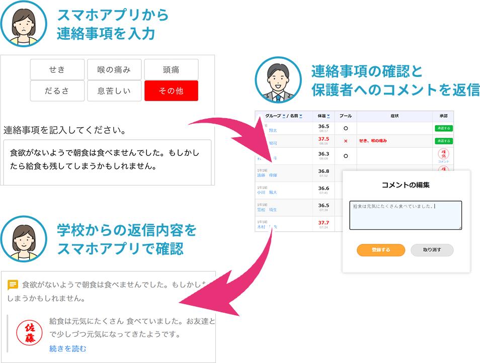 保護者が登録したコメントに対し、学校側から個別に返信を行うことができるので、これまで紙の連絡ノートでやり取りを行っていた際の手間や時間を大幅に削減することが可能になり、学校・保護者間のやり取りがよりスムーズになります。