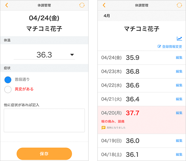 アプリからお子さまの体温と体調を登録します。過去に登録した記録も確認できますので、ご家庭での体調管理にも活用できます。