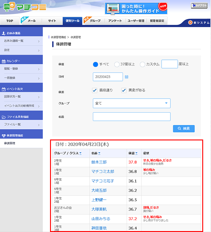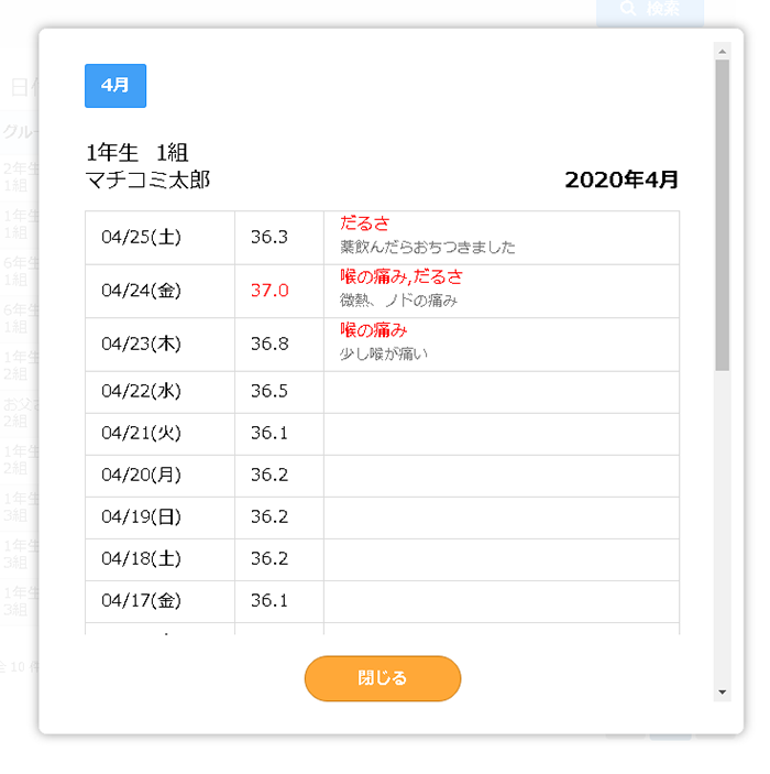一覧画面でお名前をクリックすると、個人の体調の記録を過去にさかのぼって確認することができます。