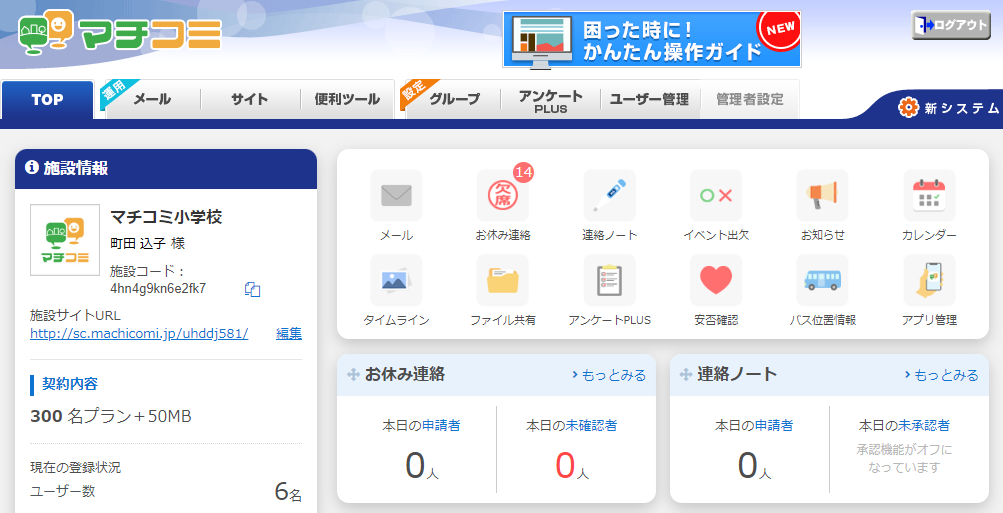 管理画面のトップに連絡ノートの画面へのショートカットをご用意しております。
