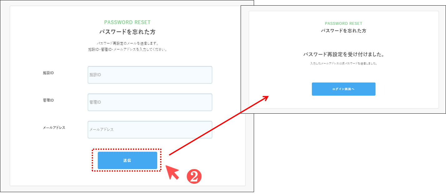 ❷施設ID・管理ID・ご登録されているメールアドレスを入力し [送信] をクリック