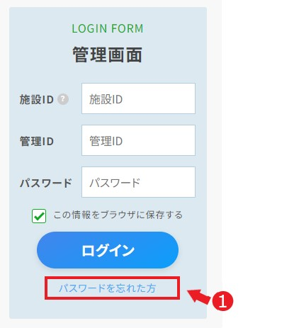 ❶管理画面にアクセスし、ログイン画面の [パスワードを忘れた方] をクリック