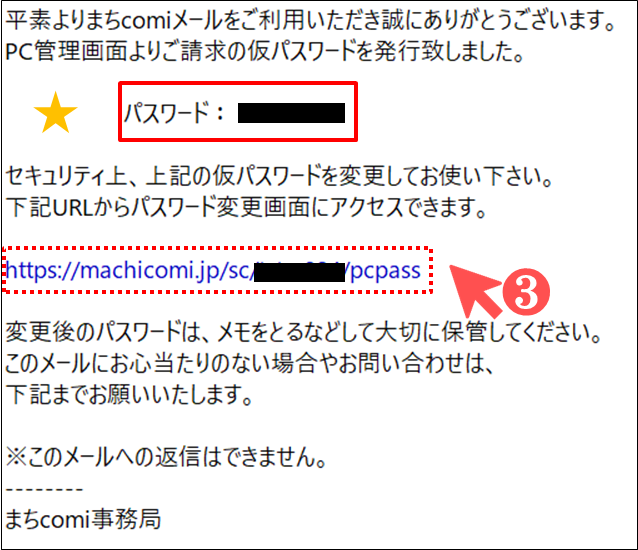❸入力したメールアドレスに★仮パスワードが届くので、★仮パスワードをコピーし、届いたメールに記載されているURLをクリック