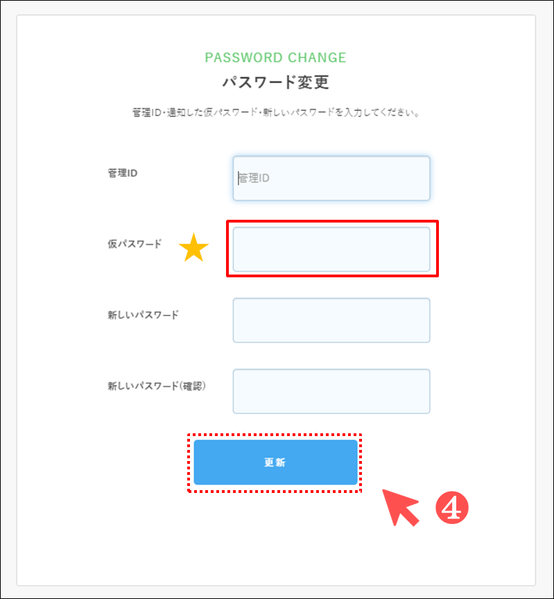 ❹管理ID、★仮パスワード、新しいパスワードを入力し、[更新]をクリック