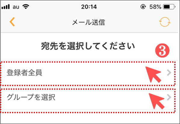 モバイル管理画面からのメール送信は、一斉送信かグループ別送信のみになります。アンケートや個別指定での送信はできませんのでご注意ください。
