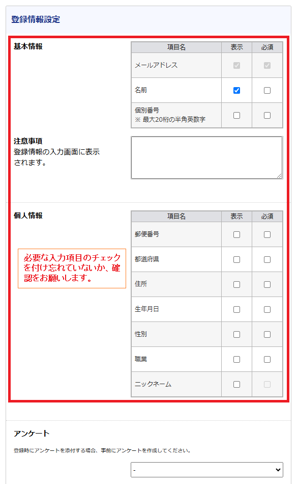 名前の設定については、管理画面の「グループ」→「グループの設定」から、「登録情報」設定を行なってください。