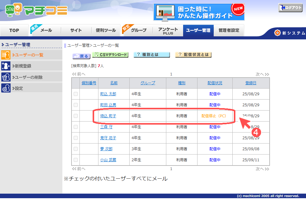 ❹「配信停止」となっている登録者の名前のリンクをクリックします。