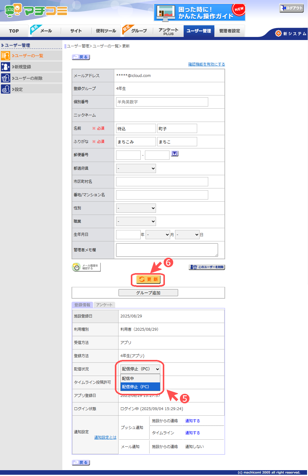 ユーザーの詳細画面で以下に該当する場合、施設からのメールが受信出来ません