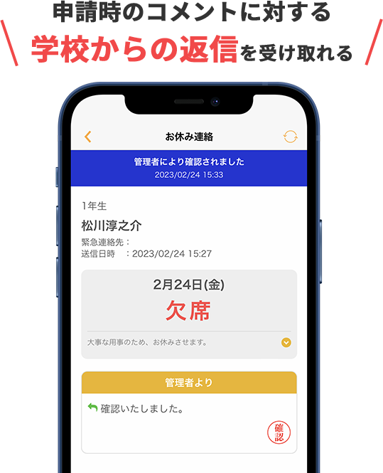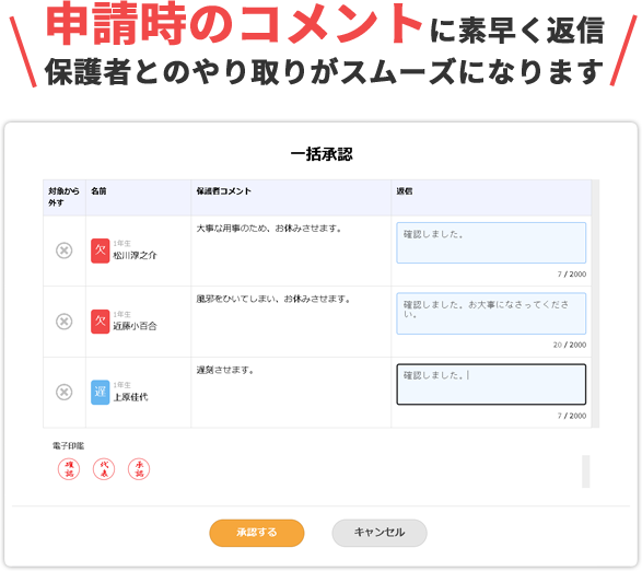 欠席理由に対するコメントの返信や児童の状況の確認など、これまで以上に学校・保護者間のやり取りがスムーズになります。