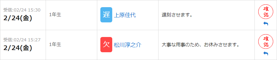 お休み連絡が承認された児童には承認スタンプを表示し、どの児童のお休み連絡を承認したかすぐに把握することができます。
