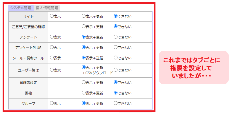 従来は、管理画面上部に並ぶ「メール」「サイト」などのタブ毎に操作できる・できないを設定する形でしたが、より詳細な機能毎の権限設定が可能になります。