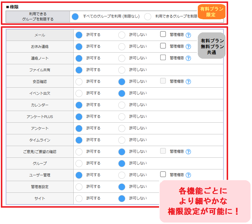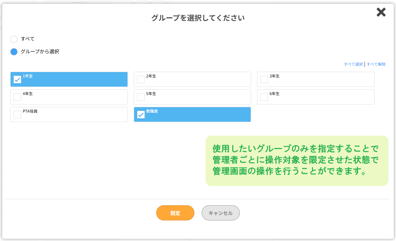 有料プランでは、使用しているグループについても権限を設定することが可能に。 A先生は「1年生のみ」使えるように、B先生は「2年生のみ」使えるように…といった設定が可能となります。