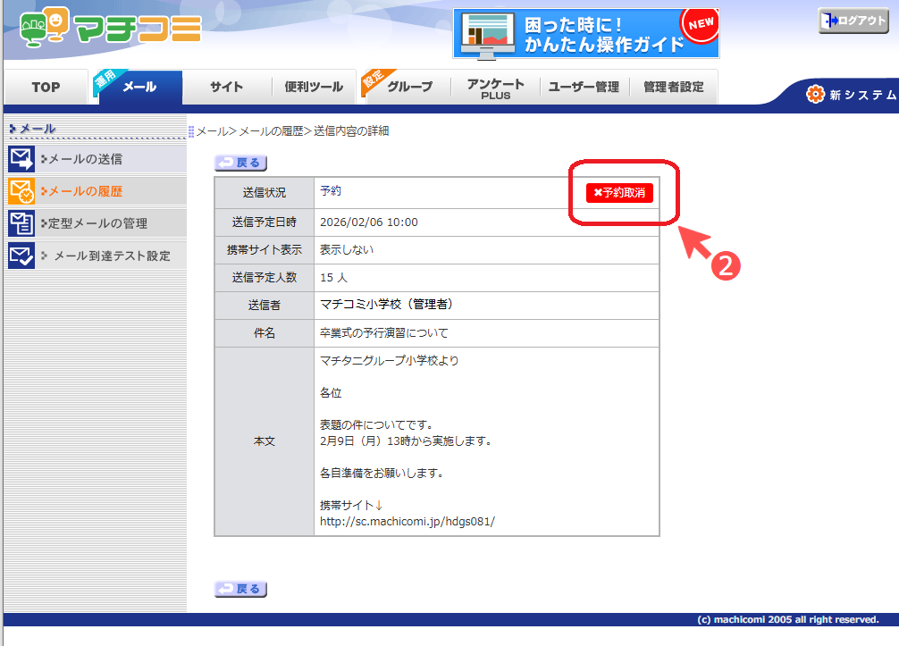 修正したい場合は、一旦予約済メールの「送信中止」手続きをした上で、改めてメールの予約をしてください。