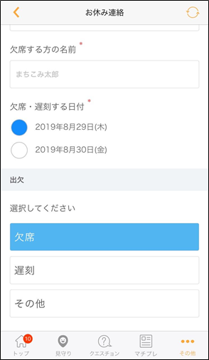 わざわざ電話をかけなくても、マチコミのお休み連絡機能からいくつか項目を入力するだけです。