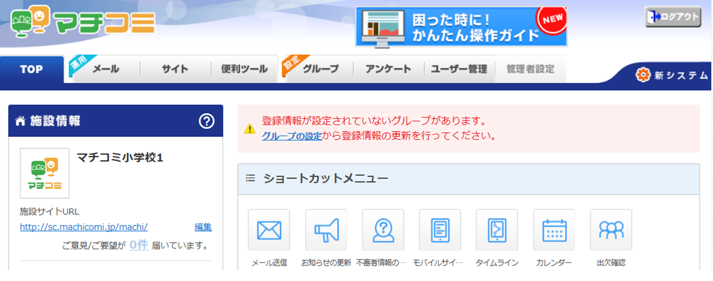 ・PC管理画面を開いた際、トップに「登録情報が設定されていないグループがあります。「グループ設定」から登録情報の更新を行ってください。」という警告メッセージが表示されている。