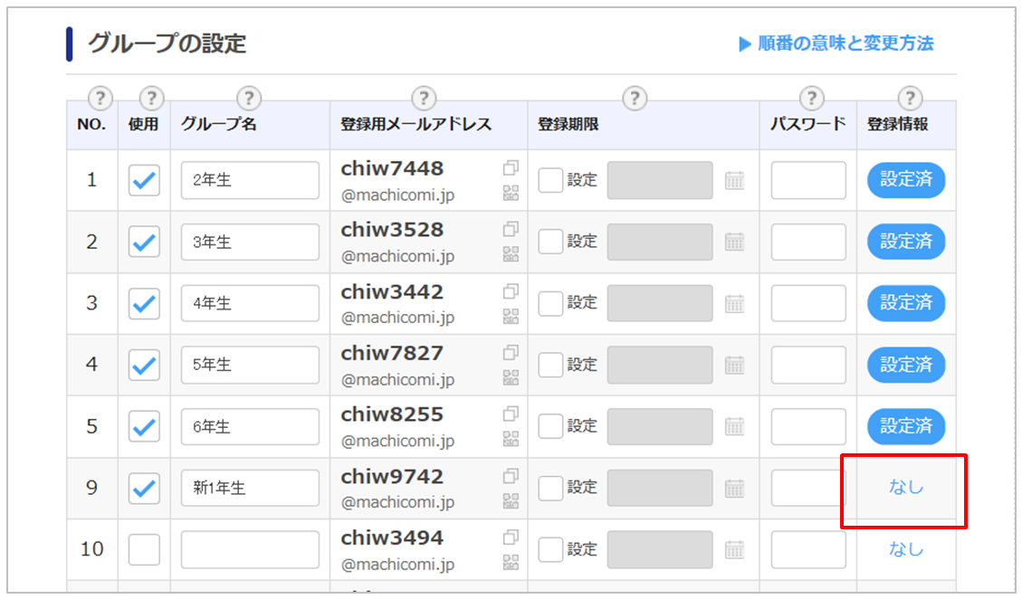 4. 各グループの列の一番右側の登録情報[なし]をクリックする