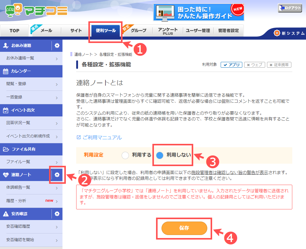 ■連絡ノートの利用をオフにする