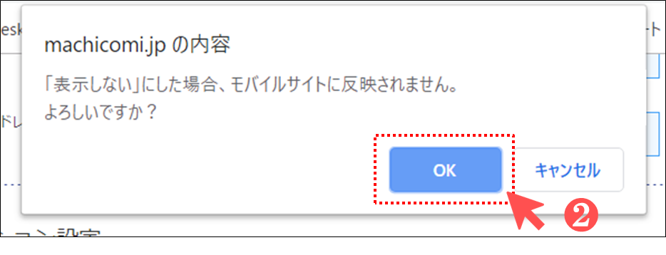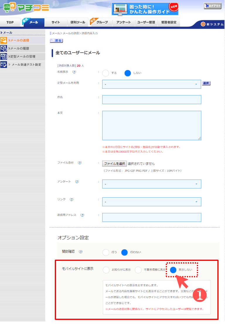 ❶ 連絡作成画面にて[オプション設定] 内 [モバイルサイトに表示] 項目で、