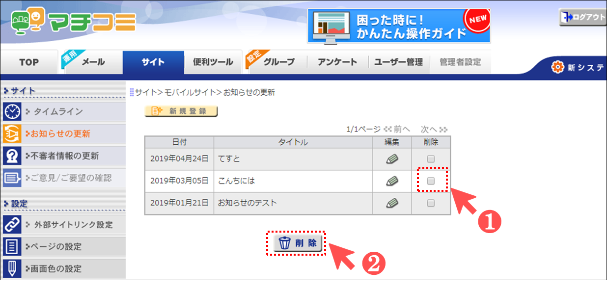 ❶ 削除したい連絡の行にあ除のチェッる削クボックスにチェックを入れる
