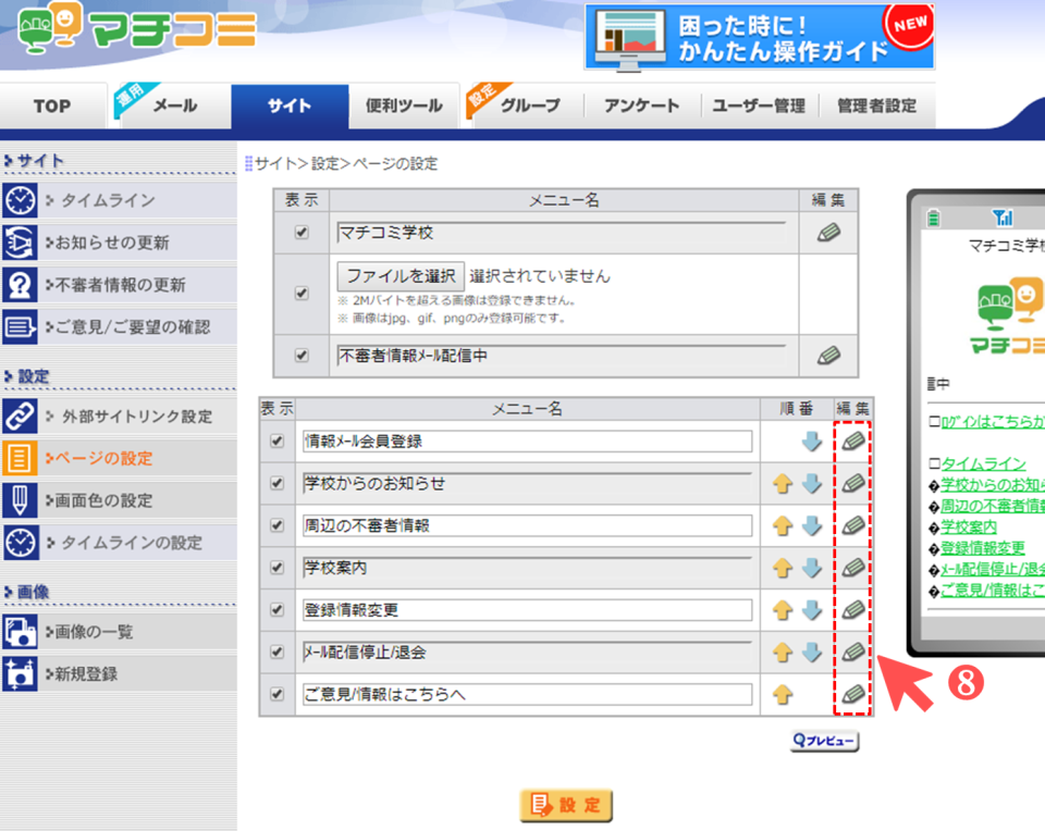 ❽ 画像を設定したいメニューの[えんぴつマーク]をクリック