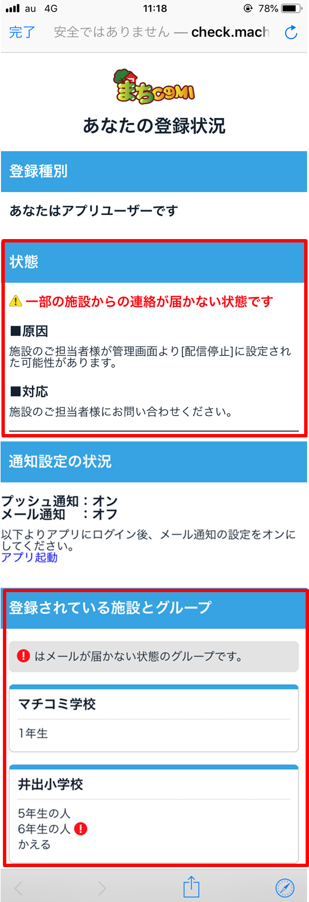 遷移先の画面にて[状態]欄に、施設から連絡が届かない原因と対応が記載されております。