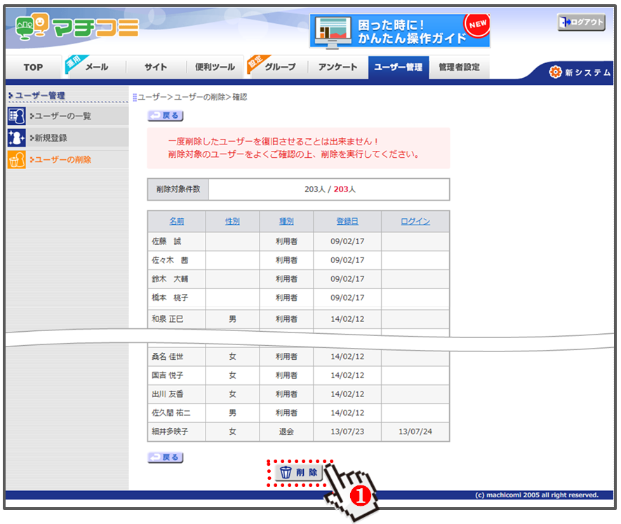 対象のユーザーをご確認の上、削除を行ってください。
