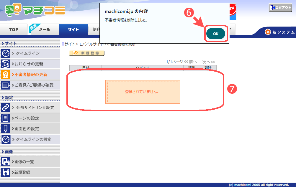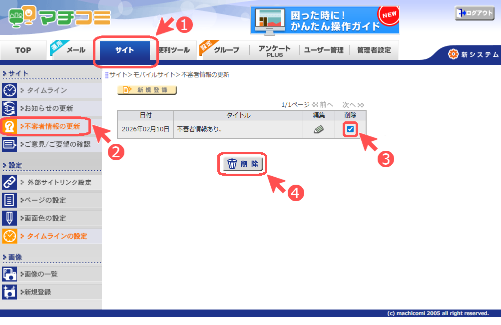 不審者情報の削除方法は「サイト」タブ内、「不審者情報の更新」より行うことができます。